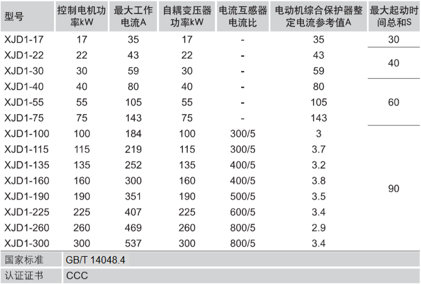 XJD1 series self-coupling voltage-releasing starter box adopts box-type protection structure; it is composed of an autotransformer, an AC contactor, a motor integrated protector, and a time relay with overload, phase loss, and undervoltage protection; for 75kW and below product, the automatic control mode is used; for 100KW and above products, there are manual and auto control models, and they are switched via a transfer switch.