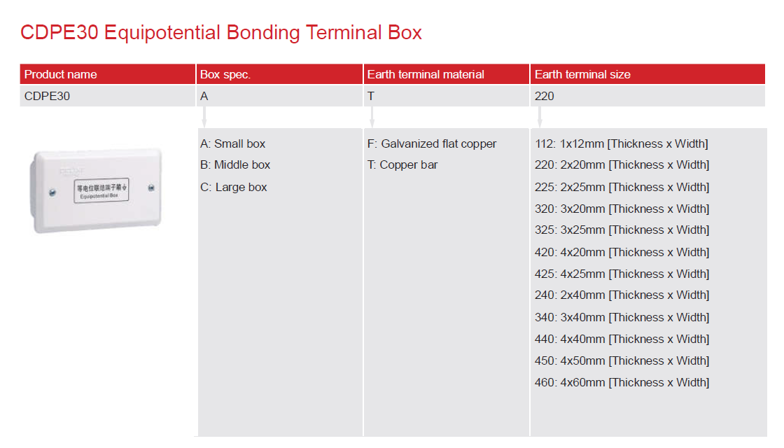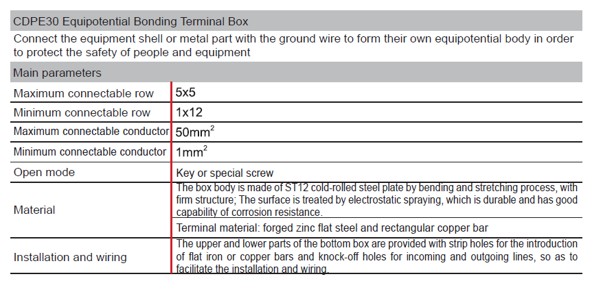 CDPE30 equipotential coupling terminal box is used to make the equipment shell or metal part connect with the ground wire to constitute their own equipotential body for safety protection of people and equipment.