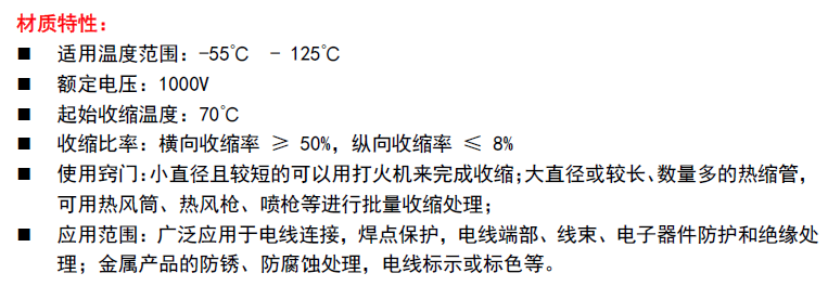 With low shrinkage temperature and fast shrinkage Suitable for insulation protection of electronic components such as wires Used for identification and distinguishment of wires and other products There are a variety of colors and sizes of products for selection