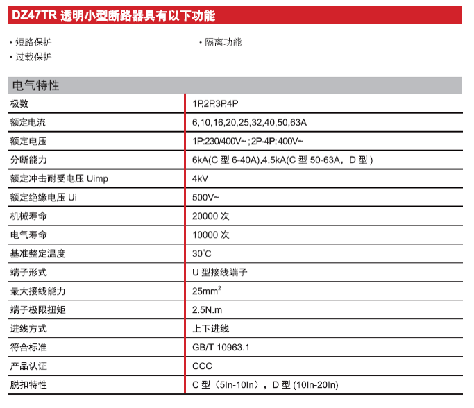 DZ47TR transparent miniature circuit breaker is suitable for AC 50HZ low voltage terminal power distribution system with a rated voltage 230V/400V and a rated current 6-63A, and has short circuit protection, overload protection, disconnection and control functions.