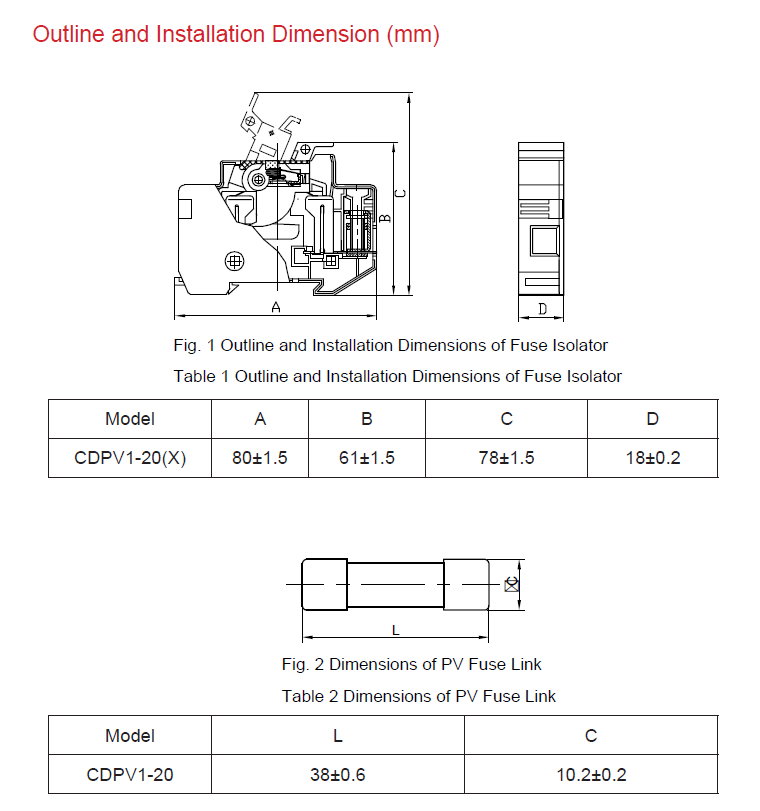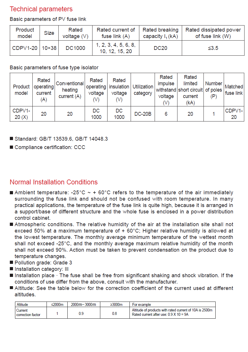 The fuse used for the protection of CDPV1-20 solar photovoltaic system is suitable for the distribution lines with a rated voltage not exceeding DC1000V, a rated current not exceeding 20A, and a rated short-circuit capacity not exceeding 20kA for short-circuit overload protection, and it is mainly used in solar photovoltaic combiner boxes as short circuit and overload protection for solar photovoltaic power generation devices and other semiconductor equipment.