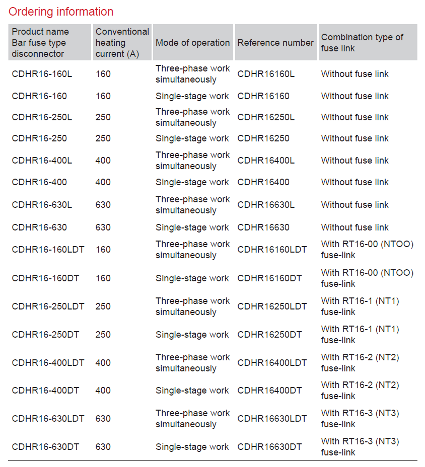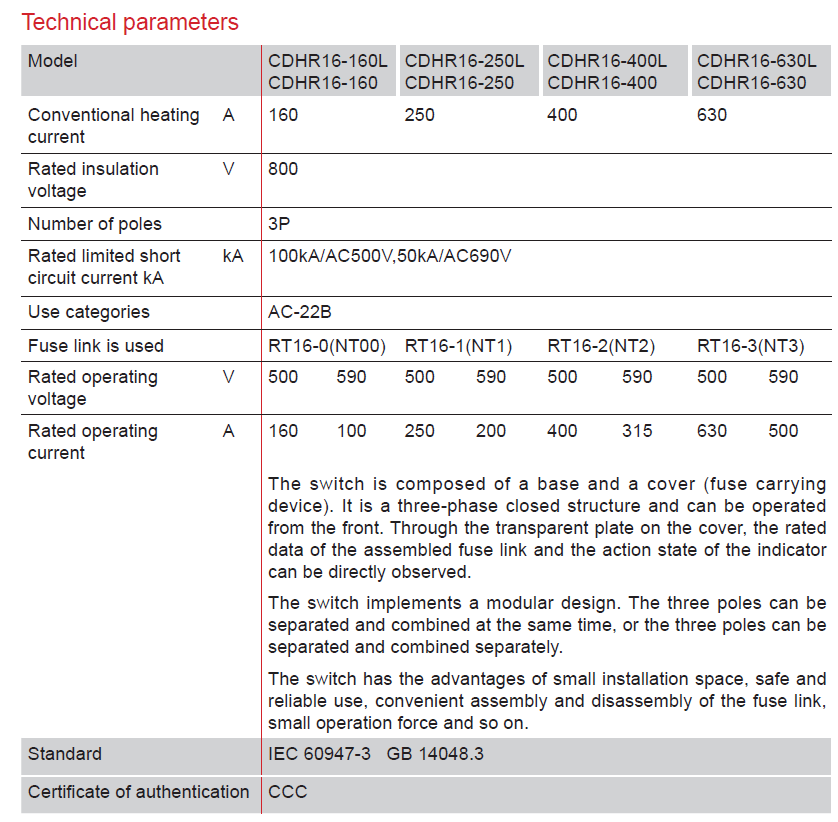 CDHR16 series strip fuse type disconnector is suitable for circuits with a rated frequency 50Hz, a rated working voltage 500/690V, and a rated working current to 630A, and mainly used in distribution circuits and motor circuits with high short-circuit current as power switch and disconnector for short circuit protection of AC circuit.