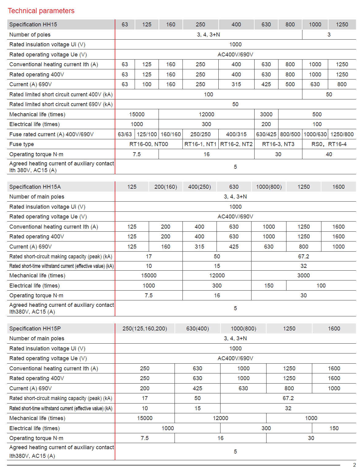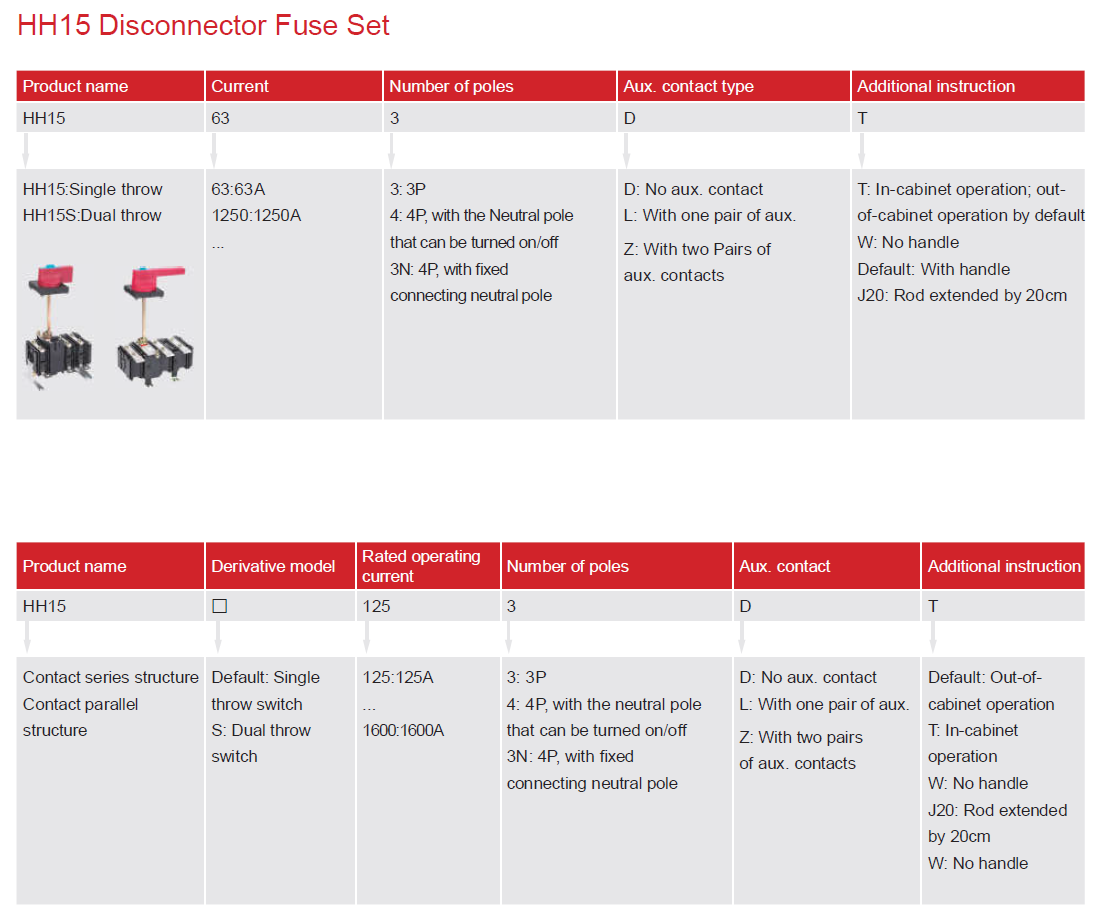 In the HH15 series switch-disconnector-fuse, the switch is mainly used in the distribution circuit and motor circuit with high short-circuit current as the main switch or master switch that is operated manually infrequently.