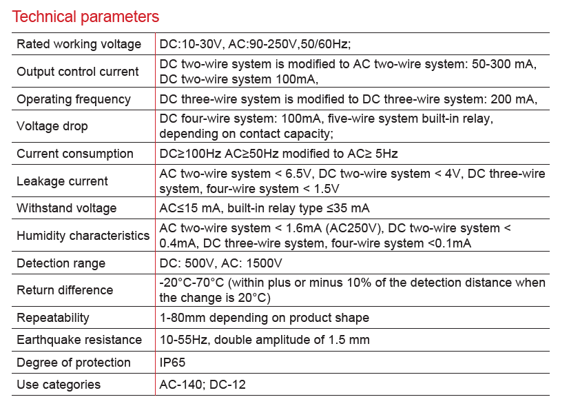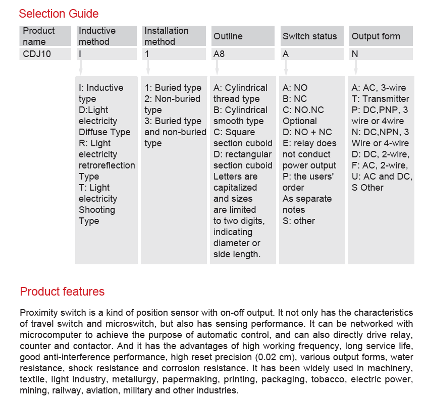 CDJ10 series proximity switch is a position sensor with switching output. It not only has the characteristics of travel switch and micro switch, but also has sensing property, and can be networked with microcomputer to realize the automatic control purposes and can also directly drive relays, counters and contactors. It has advantages of high working frequency, long service life, good anti-interference performance, high reset accuracy, multiple output forms, and waterproof, shockproof, and anti-corrosion properties.