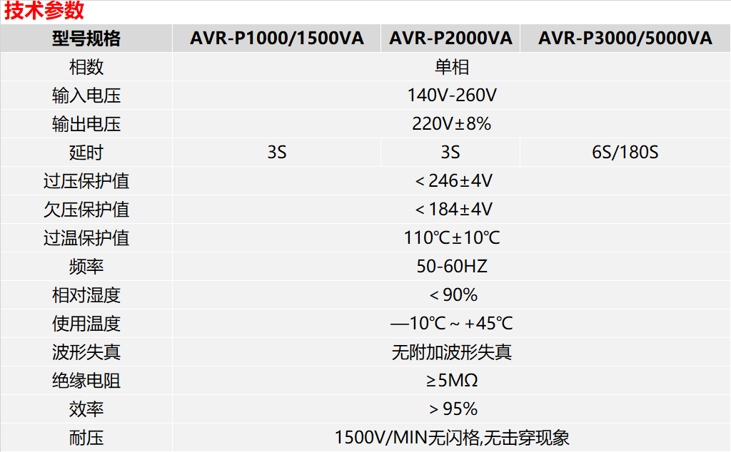 AVR-P series portable AC regulator mainly uses multi-socket output and relay AC voltage regulation method, featuring with fast response, no distortion, small size, light weight, and small power consumption; with voltage stabilization, mains output socket options (with USB output port for 2kVA and above products), all sockets have plug and play features, suitable for areas with large voltage fluctuations, and it is a voltage stabilization and protection equipment for household appliances such as air conditioner, refrigerator, and TV.