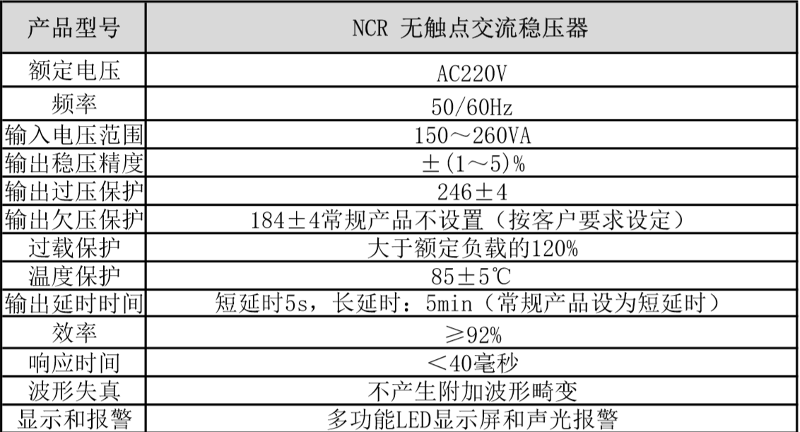 NCR-series is a contactless AC regulator integrating the advantages of many AC regulators. Through the combination of software and hardware control and multiple protection of main circuit, it is widely used in places with low voltage and frequent fluctuations to provide stable voltage for household appliances, computer data centers, communications, radio and television.