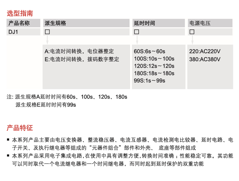 This series of products adopts electronic integrated circuit for convenient adjustment and accurate conversion time with stable and reliable performance. It has dual functions of replacing a current relay and a time relay simultaneously functionally and playing delay protection.