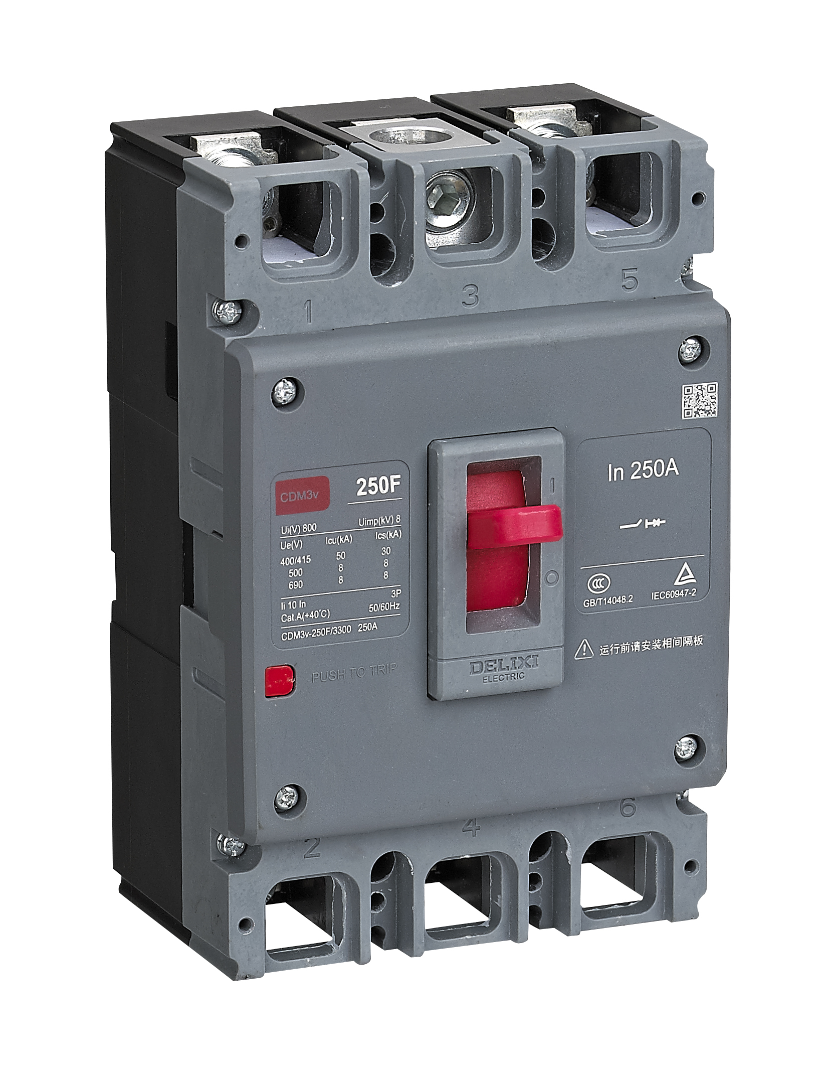 CDM3v moulded case circuit breaker is a mechanical switch used in the low-voltage distribution line can power on, carry and power off the current under normal circuit conditions, can also power on and carry the current for a certain time and power off the current for protection of lines and equipment in case of overload, short circuit, or undervoltage (accessory function) of the power distribution line. It is widely used in low-voltage power places such as electricity, construction, industry, and OEM.