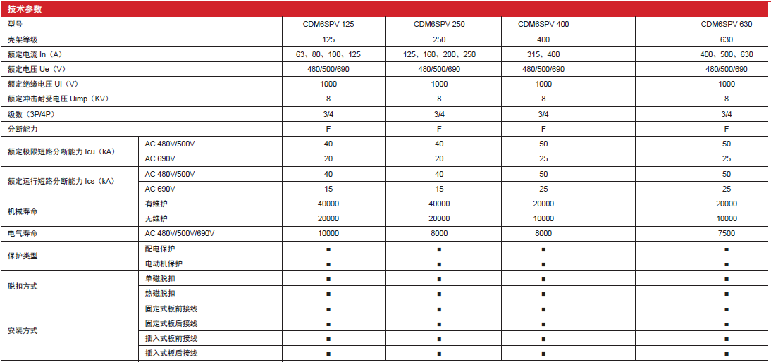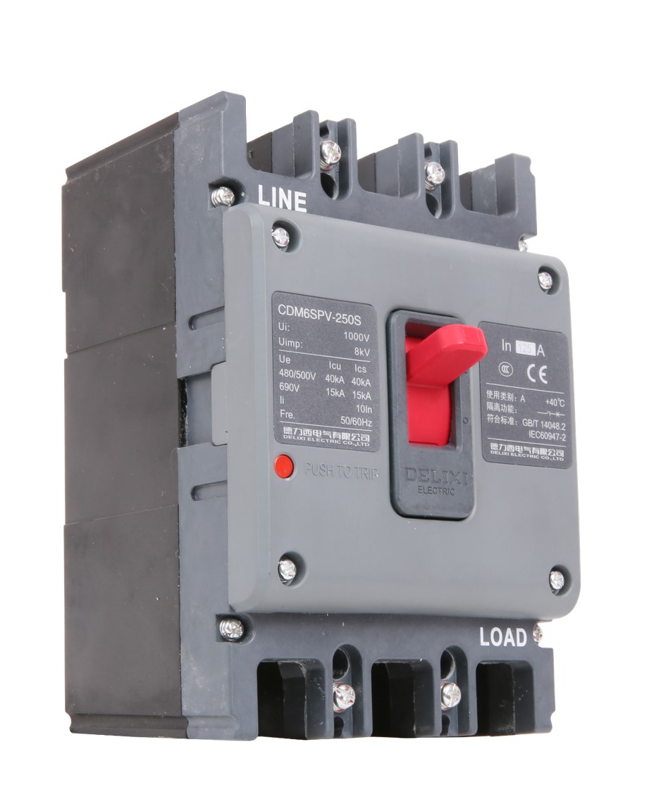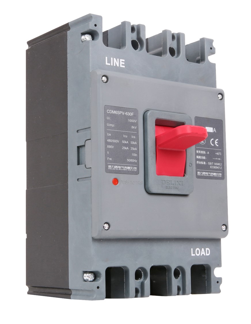 CDM6SPV photovoltaic special series moulded case circuit breaker is suitable for AC circuit with a rated working voltage AC480V, AC500V, AC690V, and a rated current 63A ~ 630A AC circuit, and can be widely used in photovoltaic power generation and combiner box for electric energy distribution and for the protection of lines and power equipment to prevent fault hazards such as overload and short circuit.