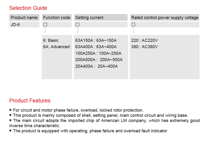 JD-6 series motor integrated protector is used as a circuit and motor phase loss, overload, stall protection. This product is mainly composed of a shell, a setting panel, main control circuit and a wiring base; the main circuit adopts the chip imported from the American LM company with extremely good inverse definite characteristics, and has run, phase loss, and overload fault indicators.