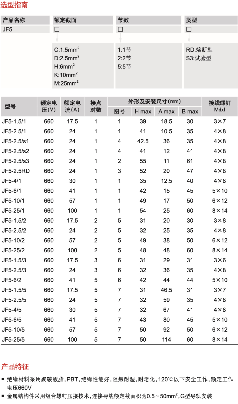 The insulation material adopts polycarbonate or PBT with good insulation property, flame and moisture resistance, and aging resistance, and can work at 120℃ and below with a rated operating voltage 660V; the metal structural parts adopt combined screw crimping technology, the rated cross-sectional area of the connecting wire is 0.5~50mm2, and the G-shaped rail-mounted method is used.