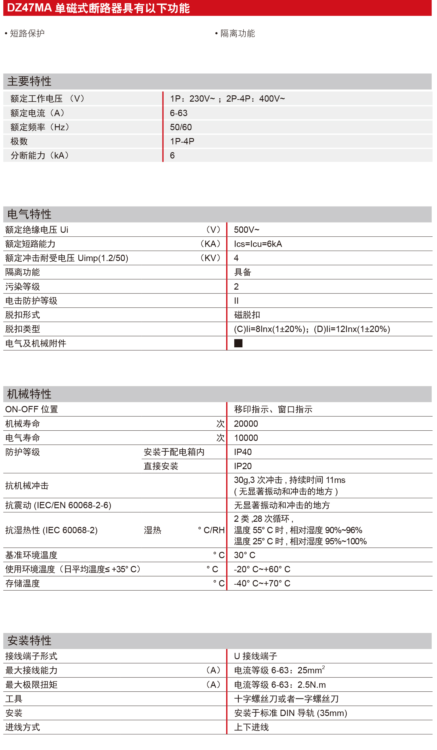 Home page >Products >Power Distribution Products >Final Distribution >Miniature Circuit Breaker >Miniature Standard Circuit Breaker (GB14048.2) >DZ47MA Single Magnetic Circuit Breaker