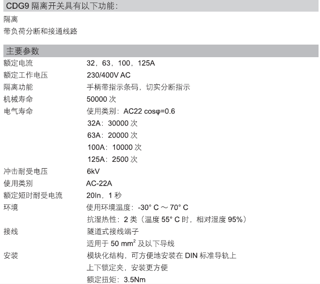 Suitable for AC 50HZ low voltage terminal power distribution system with a rated voltage 230V/400V; With function of disconnection and line breaking and making with load;