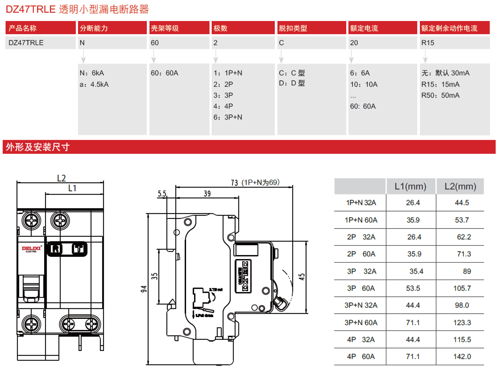 DZ47TRLE transparent small residual current circuit breaker is suitable for AC 50HZ low voltage terminal power distribution system with a rated voltage 230/400V and a rated current 6-60A, and has overload protection, short circuit protection, and leakage protection functions.