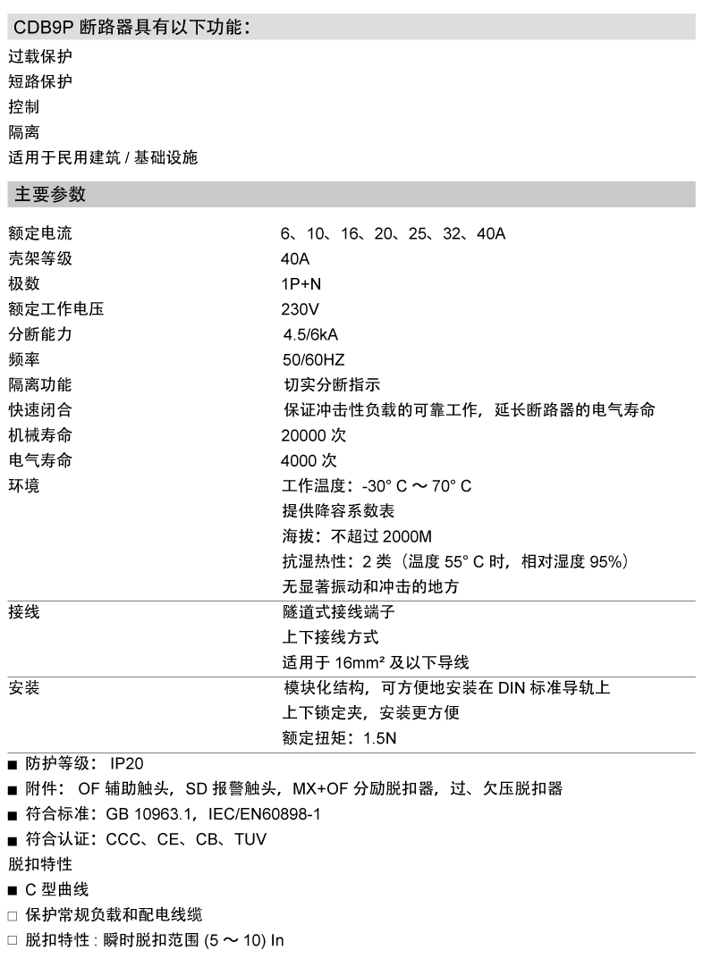 Suitable for AC 50HZ low voltage terminal power distribution system with a rated voltage 230V With short circuit protection, overload protection, disconnection and control functions