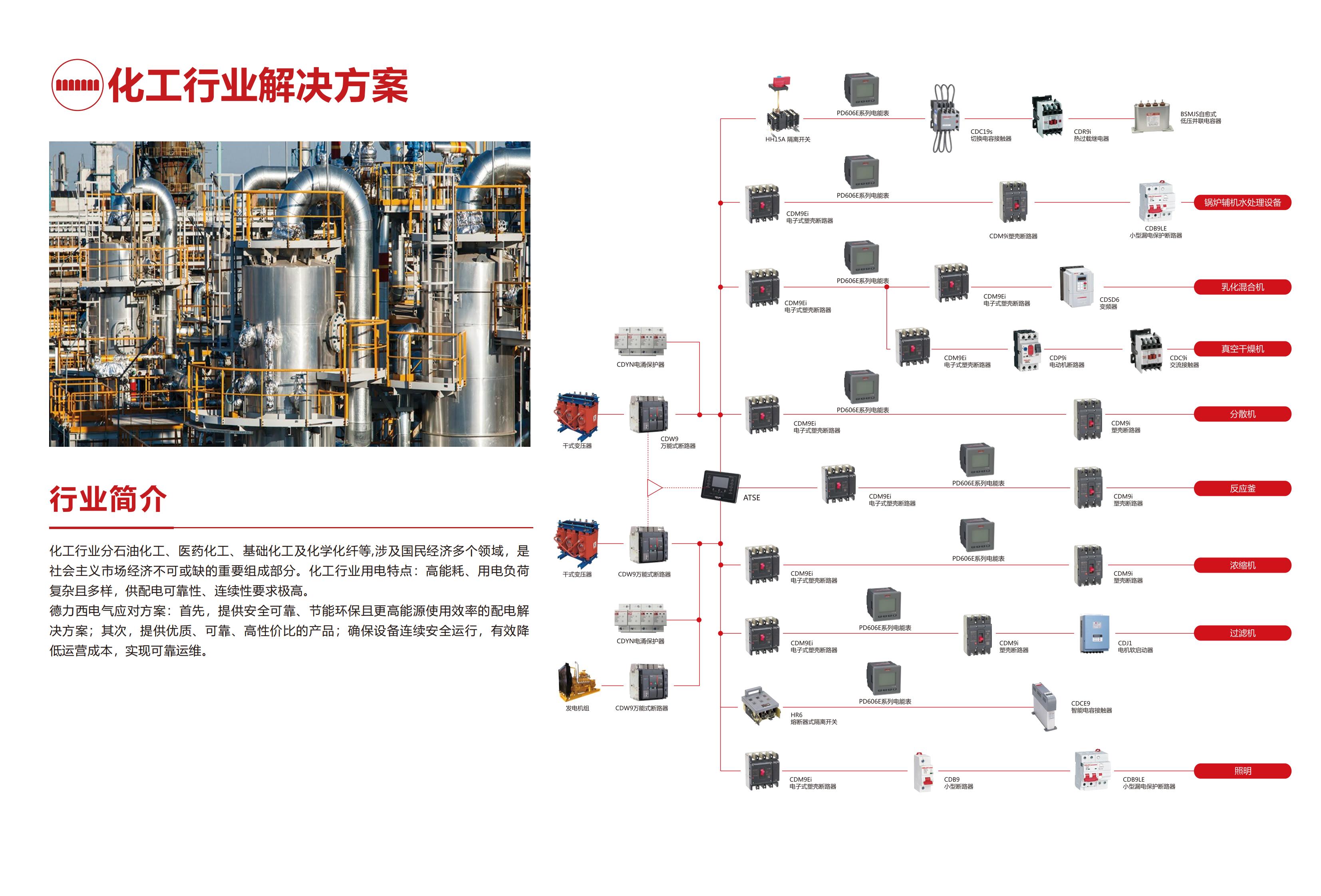 化工行業(yè)是國家綜合國力的體現,近年來,化工企業(yè)數量多、規(guī)模大,連續(xù)性強、安全性要求高,配電自動化要求高,因此對供電連續(xù)性、安全性、可靠性提出更高要求。針對化工行業(yè)的需求特點,德力西電氣提出了行業(yè)領先的解決方案,通過對系統(tǒng)各個參數的計算,合理選擇配電保護裝置,并采用微機保護系統(tǒng)進行全面監(jiān)測與控制,保障生產安全。