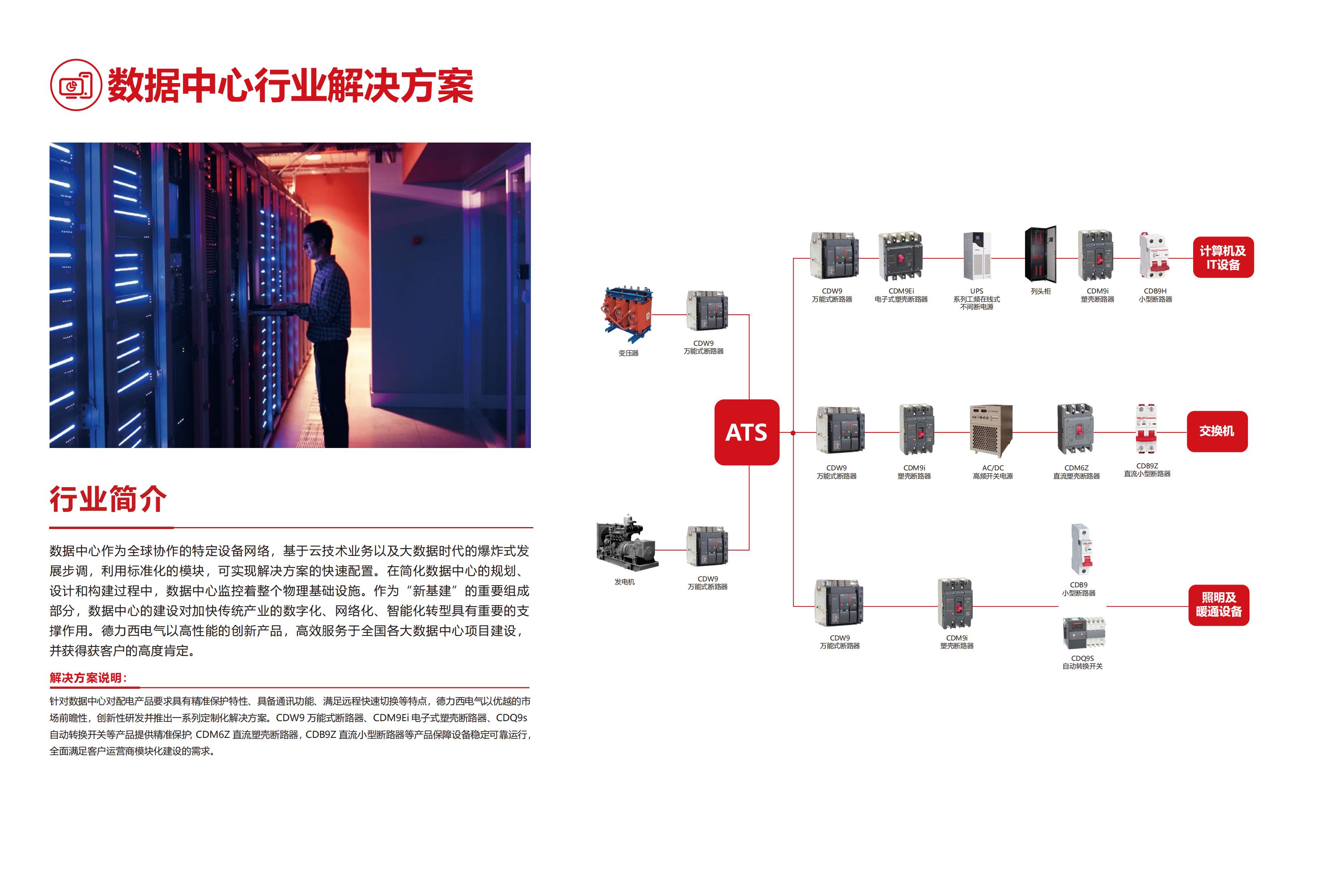 數(shù)據(jù)中心作為全球協(xié)作的特定設(shè)備網(wǎng)絡(luò),基于云技術(shù)業(yè)務(wù)以及大數(shù)據(jù)時代的爆炸式發(fā)展步調(diào),利用標(biāo)準(zhǔn)化的模塊,可實現(xiàn)解決方案的快速配置。在簡化數(shù)據(jù)中心的規(guī)劃、設(shè)計和構(gòu)建過程中,數(shù)據(jù)中心監(jiān)控著整個物理基礎(chǔ)設(shè)施。作為“新基建“的重要組成部分,數(shù)據(jù)?中心的建設(shè)對加快傳統(tǒng)產(chǎn)業(yè)的數(shù)字化、網(wǎng)絡(luò)化、智能化轉(zhuǎn)型具有重要的支撐作用。德力西電氣以高性能的創(chuàng)新產(chǎn)品,高效服務(wù)于全國各大數(shù)據(jù)中心項目建設(shè),并獲得客戶的高度肯定。